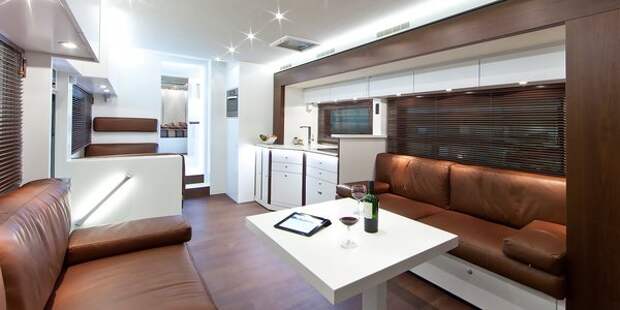 Мебель автодома выполнена исключительно из дорогих пород дерева. В зоне гостиной расположены два дивана из натуральной кожи и столом посередине. Для любителей фильмов установлена современная аудиосистема, спутниковое телевидение с интернетом и плазменный телевизор.