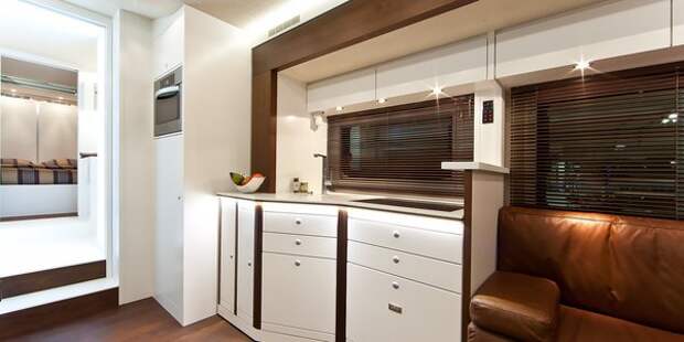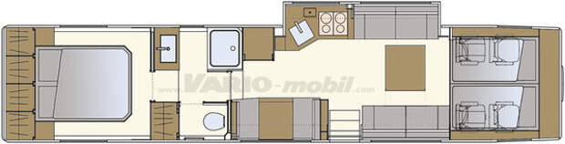 Vario Alkoven 1200 рассчитан на комфортное проживание 4 человек. Дизайн и функционал интерьера продуман до мелочей! Внутри этого автобуса скрывается роскошная «квартира» с кухней, гостиной, спальней с большой двухместной кроватью, ванной комнатой и дополнительной раскладывающейся спальной зоной еще на двоих человек.