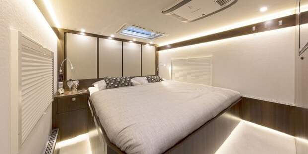 В спальной зоне установлена большая двухспальная кровать, над которой расположена отдельная система климат контроля. Шкафы спрятаны за мебельными панелями.