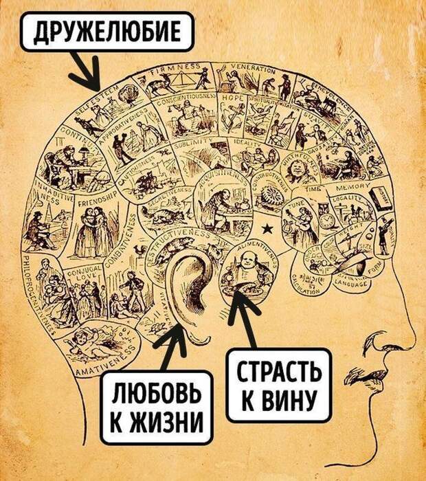 Австрийский врач и анатом Франц Йозеф Галль считал, что мысли, эмоции и психические особенности человека влияют на форму его черепа, так как заложены в полушариях мозга. Он рисовал «френологические карты», где каждая зона отвечала за определенную черту характера. Выпуклость на черепе в этом месте означала, что данная черта у человека развита, а впадина — что нет.