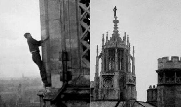Часовня Королевского колледжа (King’s College) в Кембридже не раз становилась излюбленной целью безумных паркурщиков и скалолазов, хотя высота этого здания составляет целых 29 метров. Шедевральное готическое строение давно признано визитной карточкой вуза, поэтому некоторые проделки ночных альпинистов стали особенно провокационными. Например, администрации колледжа пришлось потратить ни одну тысячу фунтов, чтобы нанять высотников со специальным оборудованием и очистить шпили часовни от дорожных конусов, унитазов, пластиковых стульчаков и шапок Санта-Клауса, которые в разные годы на высоту затащили неизвестные ночные альпинисты. И все это произошло уже в 21 веке…